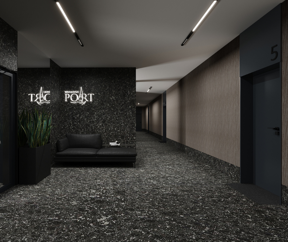 Korytarze i klatki schodowe w Warmińskim Porcie mają tworzyć wrażenie spójnej, eleganckiej przestrzeni – takiej, która od pierwszego kontaktu komunikuje jakość inwestycji. W prospekcie inwestycji wskazano m.in. posadzki z płyt kamiennych lub gresu, ściany wykończone tapetami albo okładzinami ceramicznymi i kamiennymi oraz aluminiowe drzwi wejściowe do klatek schodowych.